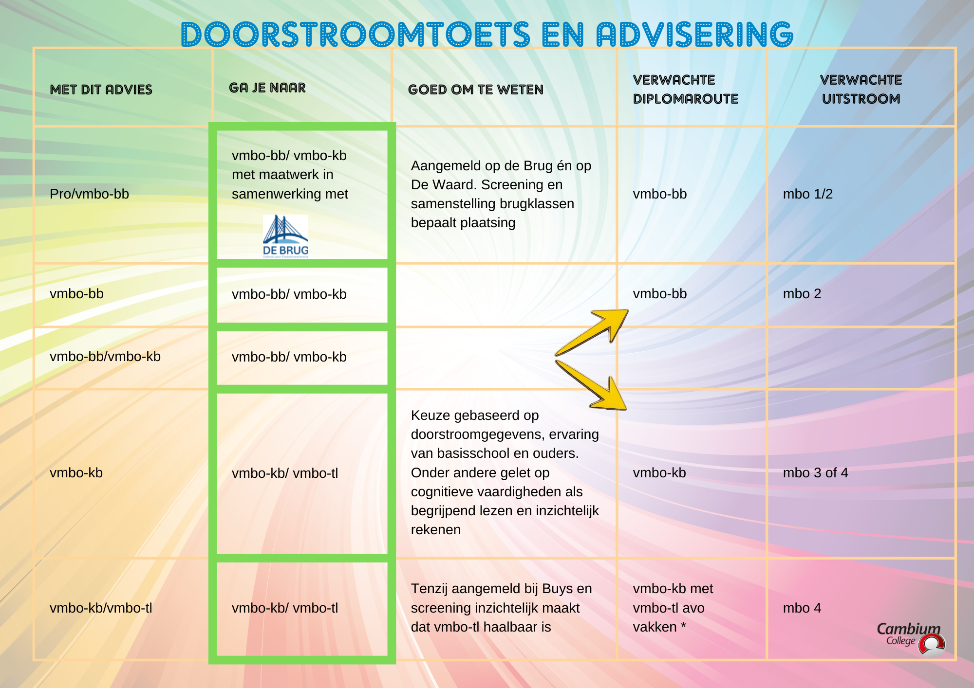 - voor de brugklassen van vmbo-bb en vmbo-kb neemt u contact op met de heer Paul de Jongh (JGH@cambiumcollege.nl).
