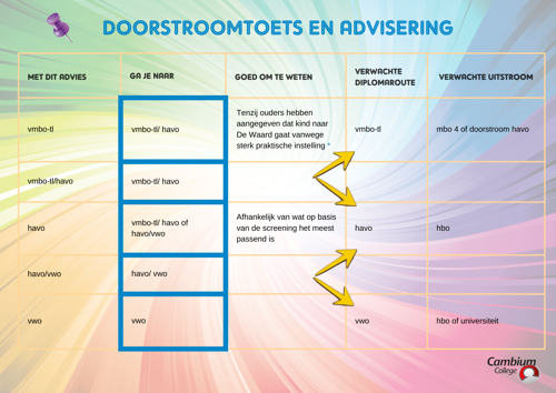- voor de brugklassen van vmbo-bb en vmbo-kb neemt u contact op met de heer Paul de Jongh (JGH@cambiumcollege.nl).